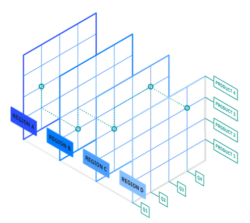 - Example: Sales figures might have several dimensions related to Location (region, country, state/province, store), Time (year, month, week, day), Product (clothing, men/women/children, brand, type);