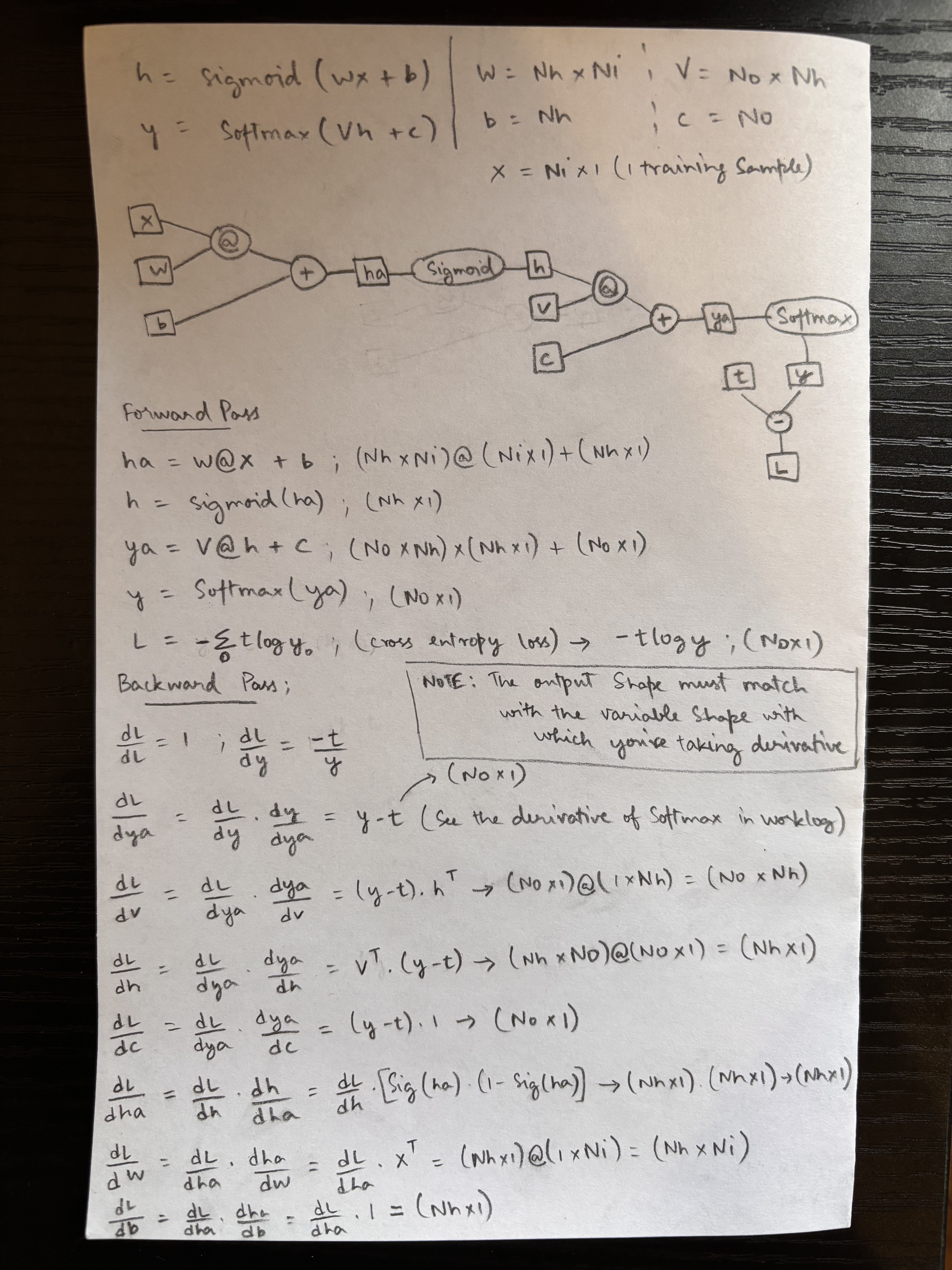 \[\begin{aligned} h_a &= W @ x + b \quad && (Nh \times Ni) @ (Ni \times 1) + (Nh \times 1) \\ h &= \text{Sigmoid}(h_a) \quad && (Nh \times 1) \\ y_a &= V @ h + c \quad && (No \times Nh) \times (Nh \times 1) + (No \times 1) \\ y &= \text{Softmax}(y_a) \quad && (No \times 1) \end{aligned}\]Cross-entropy loss: \(L = -\sum_{i=0}^{n} t \log y_i \quad \text{(scalar)} \rightarrow -t \log y \text{(vector)} \quad (No \times 1)\)